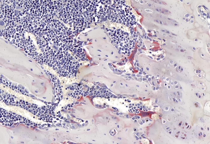 TRAP(抗酒石酸酸性磷酸酶,Tartrate-Resistant Acid Phosphatase)染色是破骨细胞(Osteoclast)鉴定的经典组织化学方法。该技术通过检测破骨细胞中高表达的TRAP酶活性(在酒石酸存在下仍保持活性),生成红色或紫色沉淀产物,从而特异性标记破骨细胞及其前体细胞。TRAP染色具有高度特异性和直观形态学展示优势,广泛应用于骨质疏松、骨转移癌及关节炎等骨代谢疾病研究,可定量评估破骨细胞数量、分布及活性,为骨重塑机制和药物开发提供关键实验依据。