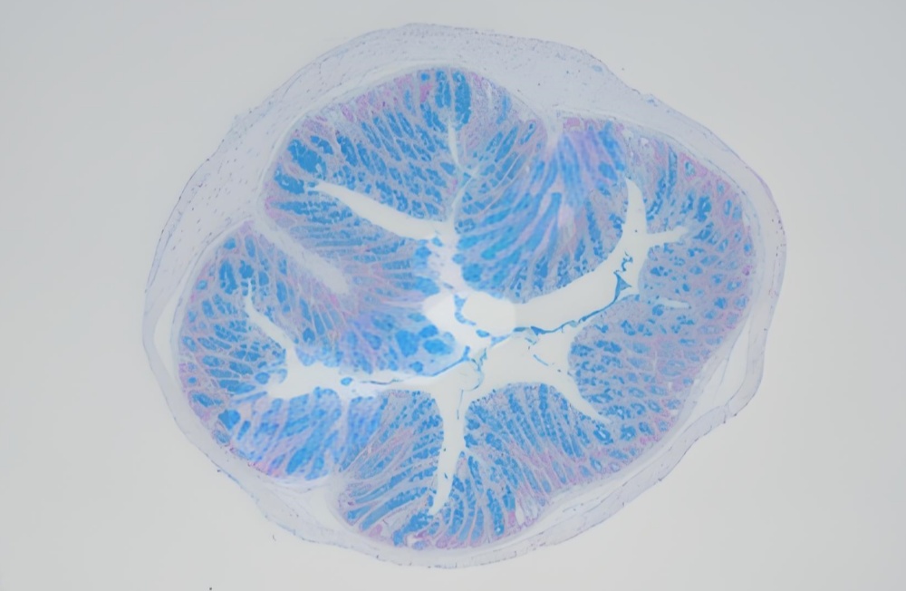 阿利新蓝染色的原理是基于阳离子染料与酸性粘液物质的静电结合。阿利新蓝染料中的阳离子基团与酸性粘液物质(如硫酸化粘多糖和羧化粘多糖)中的阴离子基团(如硫酸根和羧基)结合,形成稳定的复合物,从而将酸性粘液物质染成蓝色。染色结果可通过普通光学显微镜观察。