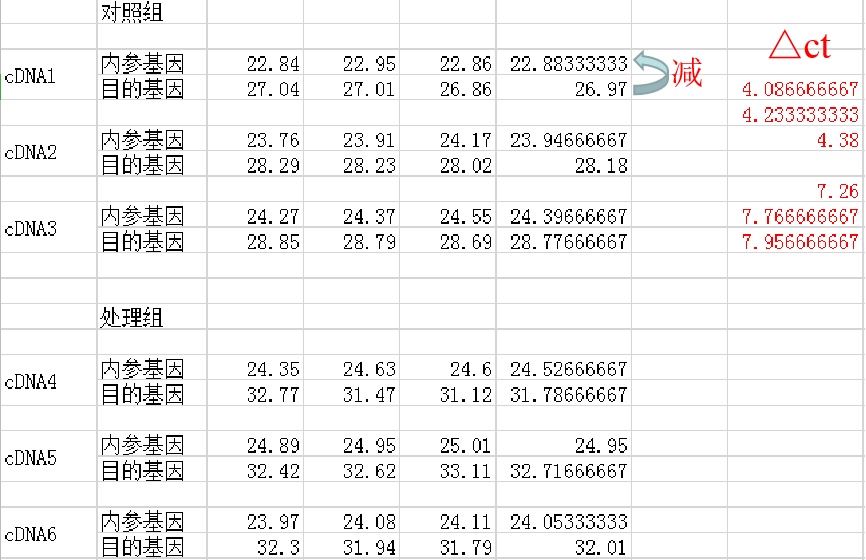 4. 计算△ct值。用刚刚计算得到目的基因的平均ct值减去内参基因的平均ct值,即得到了△ct值。下图红色字体从下到下依次为cDNA1到cDNA6的目的基因平均ct值减去内参基因平均ct值。