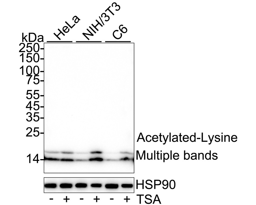阳性对照 | HeLa细胞裂解液、TSA处理的HeLa细胞裂解液、NIH/3T3细胞裂解液、TSA处理的NIH/3T3细胞裂解液、C6细胞裂解液、 TSA处理的C6细胞裂解液、人乳腺癌组织、人结肠癌组织、小鼠肝脏组织、大鼠肝脏组织 |